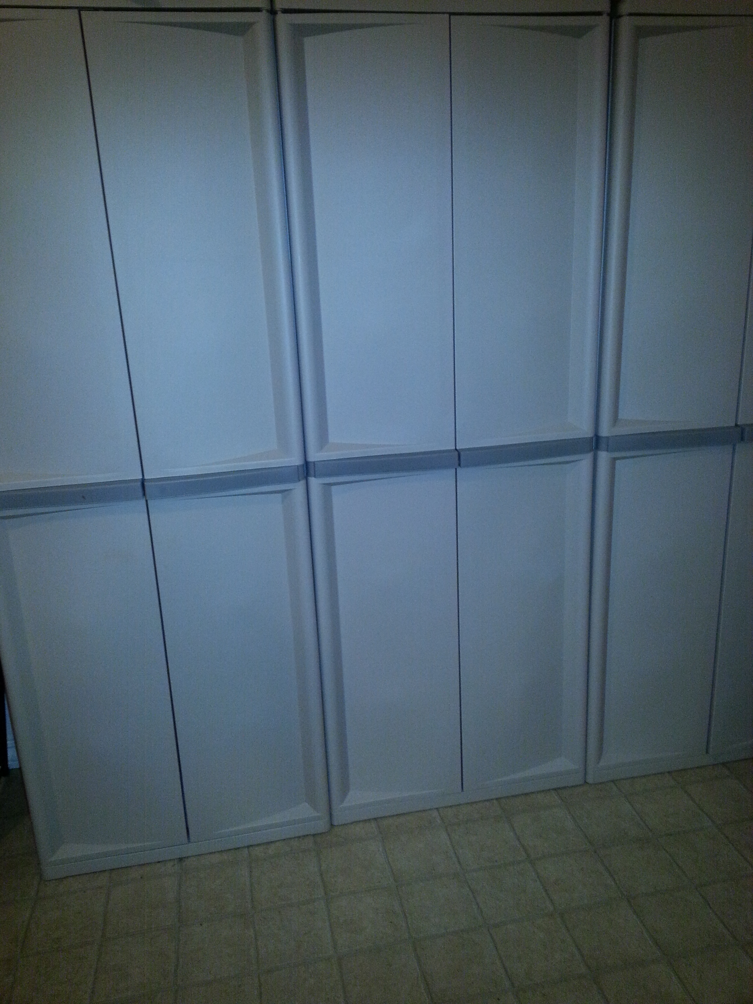 I bought these outdoor units from Walmart. They are intended for garage storage but they work perfectly in my kitchen. I relocated my pots, pans, baking sheets, etc. so that I did not have to stoop to the lower dark cabinets and dig these items out. They are neutral in color so they went with all of my decor. I actually bought three because I have one for baking and cooking supplies another for my pots and pans and one for food storage. They were around $77 each. I just bought one at a time.