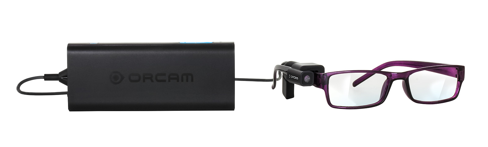 ORCAM recognizes text and products and speaks through bone-conduction earpiece.it can read newspapers, books, signs, labels on products even text or computer screen.