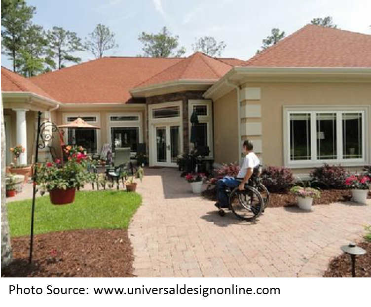 - No step entry. No one needs to use stairs to get into a universal home or into the homes main rooms.